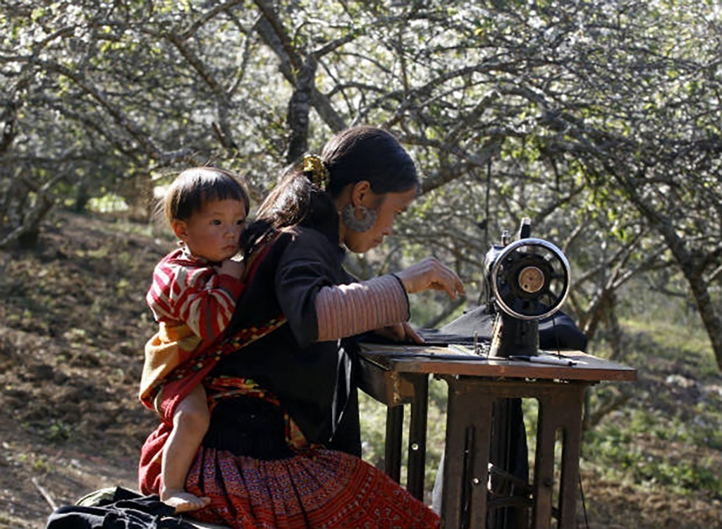 In the heart of Hmong culture, the art of textile creation is more than just a craft; it's a vibrant narrative woven into the fabric of daily life. This image beautifully captures a timeless scene: a Hmong woman, with her child securely on her back, meticulously working at a sewing machine amidst the quietude of nature. It's a powerful testament to the enduring spirit and dedication of the Hmong people in preserving their rich heritage.